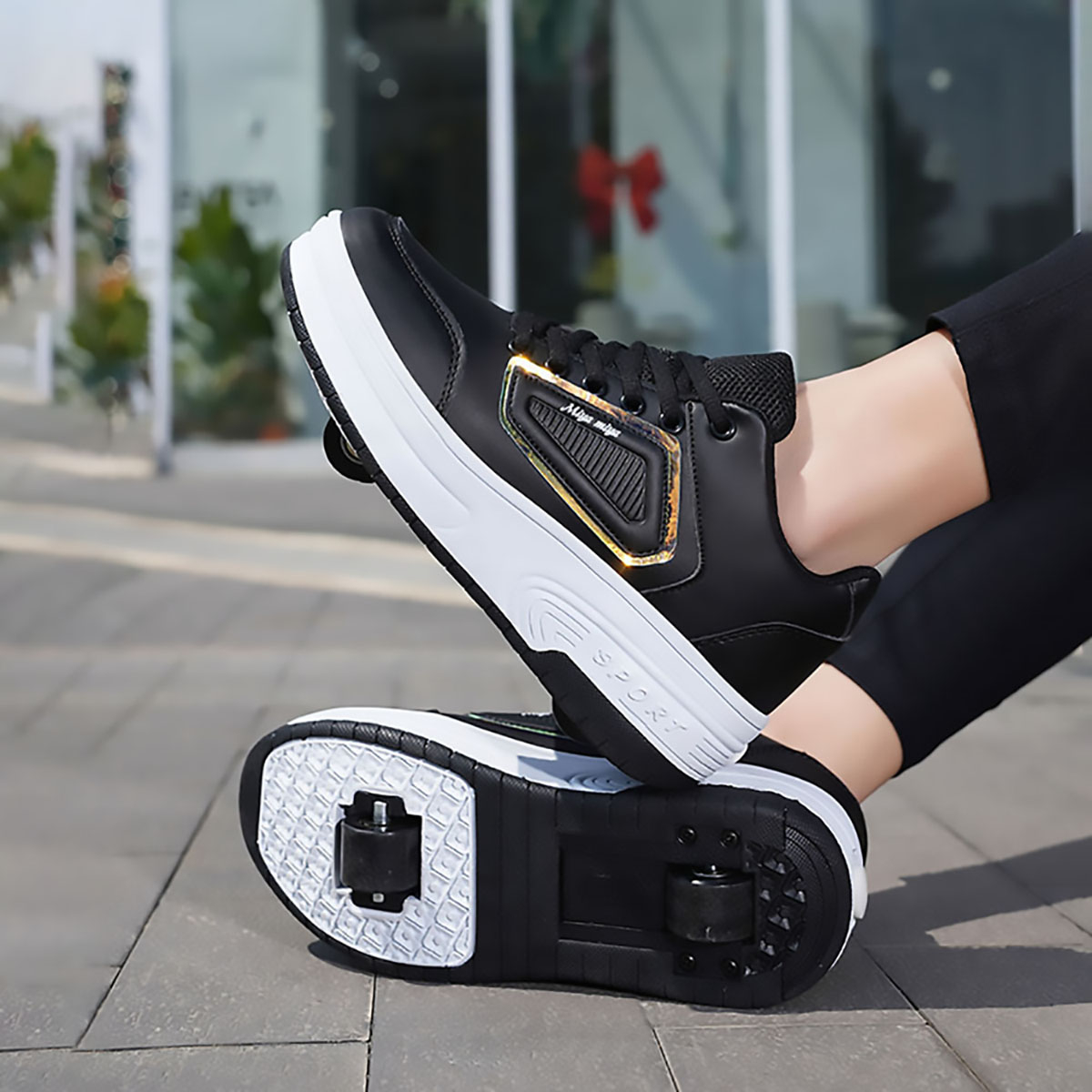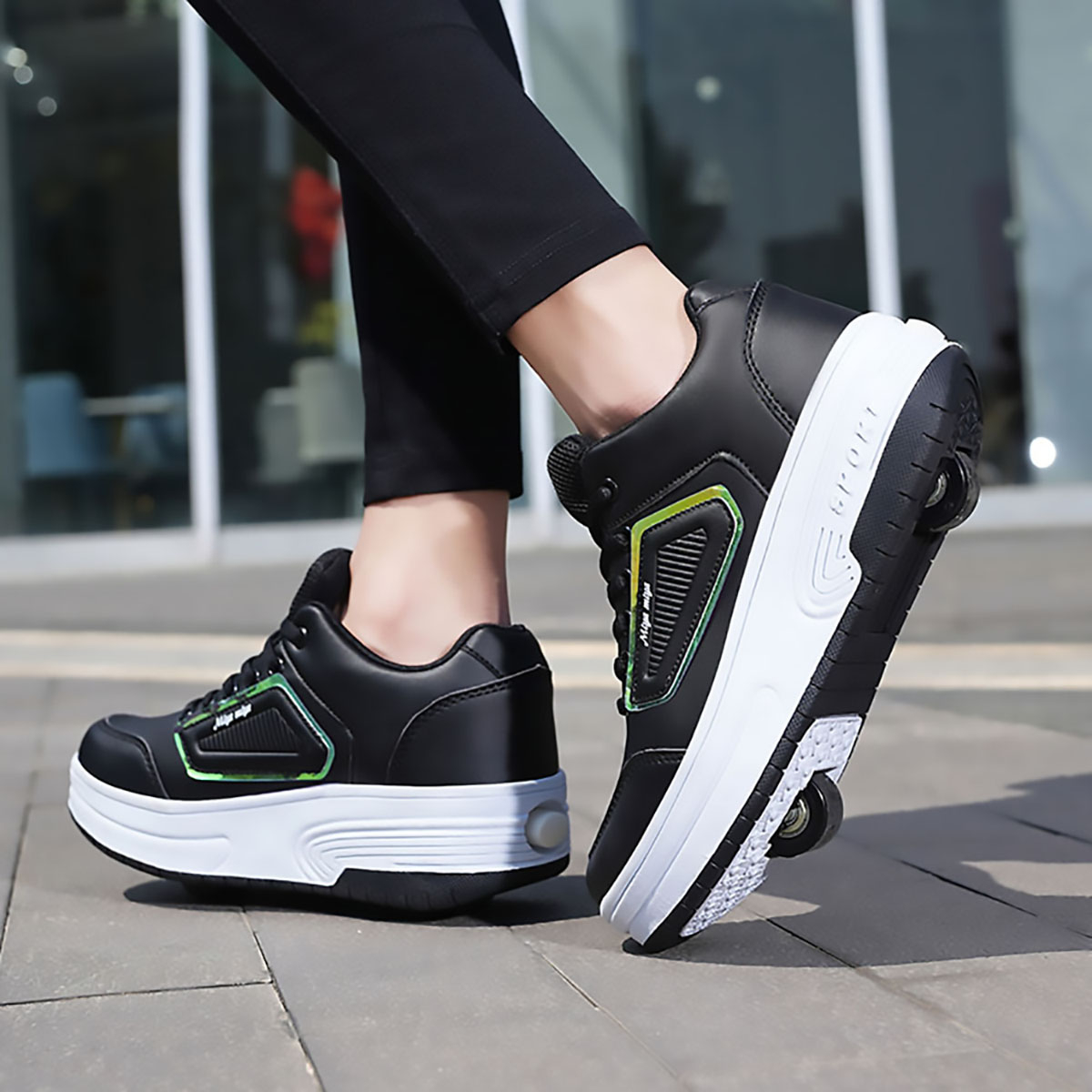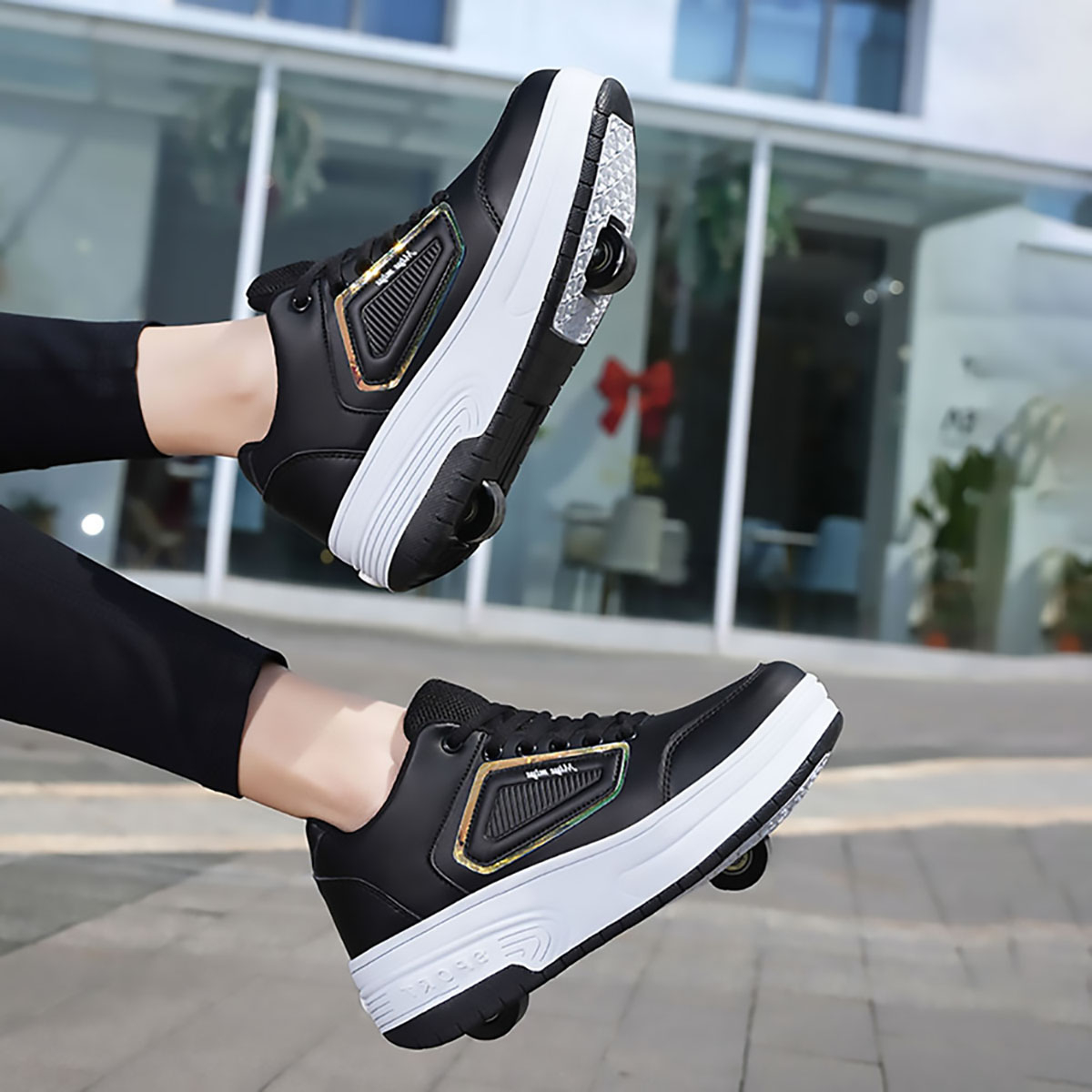 Кеды во съемными роликами 3 в 1: Могут использоваться как двухколесные ботинки, одноколесные ботинки (снимите переднее колесо и добавьте чехол) или плоские кроссовки (удерживайте кнопку за ботинками, чтобы уменьшить заднее колесо и снять переднее колесо).