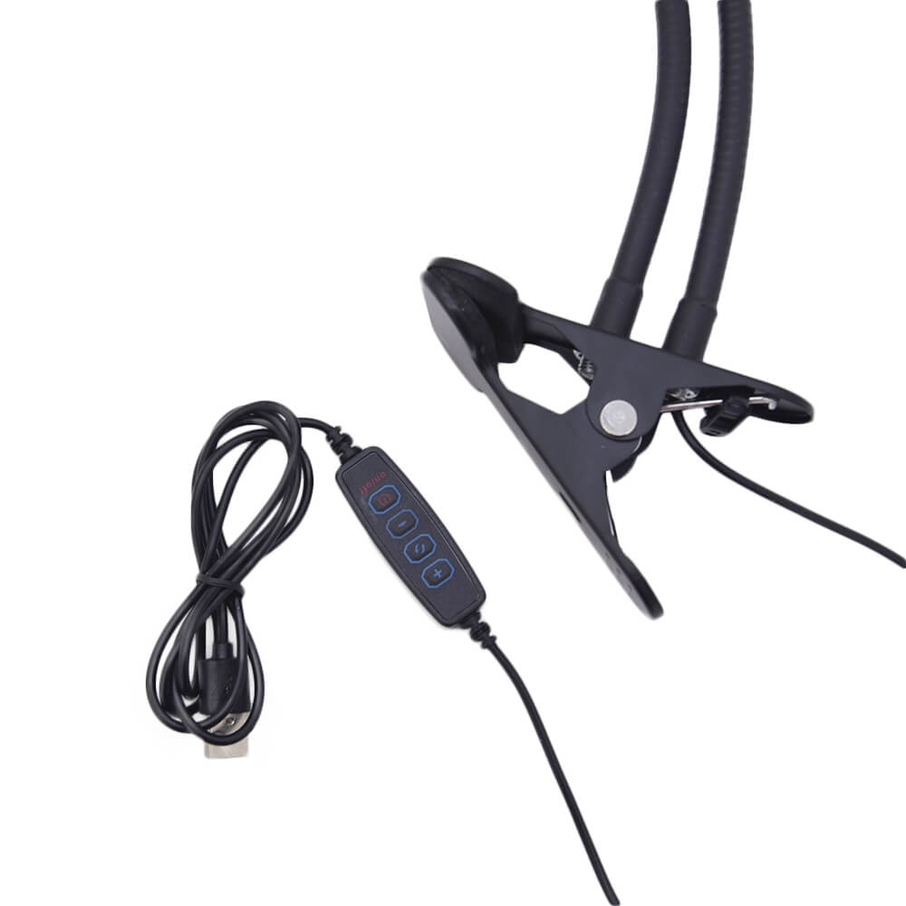 Гибкий портативный светильник для съемок на смартфон. Прибор представляет собой кольцевую безбликовую лампу на светодиодах, предназначенную для улучшения качества видео и фото съемки на улице и внутри помещения. Устройство удерживается специальной прищепкой и оснащено зажимом для смартфона. Для подключения к последнему предусмотрен разъем micro USB. Переключатель на проводе позволяет выбирать различные режимы освещения и яркость. Мощность лампы 5 Вт.